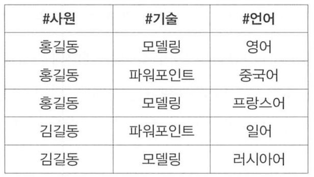 그림(1)은 조인 종속이 존재하는 릴레이션이다. 제4정규형을 설명할 때 제4정규형 그림(1) [릴레이션1]과 유사하지만 차이점이 있다. 제4정규형은 기술과 언어 속성이 독립적이었지만 그림(1) 은 연관성이 있다는 점이다. 사원과 기술, 언어 속성이 관계가 있다는 업무 요건이 존재한다.