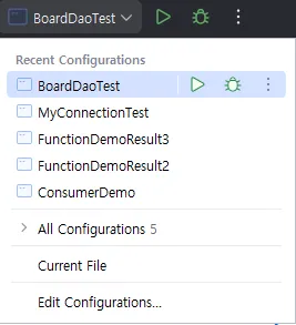 IntelliJ 우측 상단에 있는 실행버튼 왼쪽 (아래 화살표 모양)을 클릭