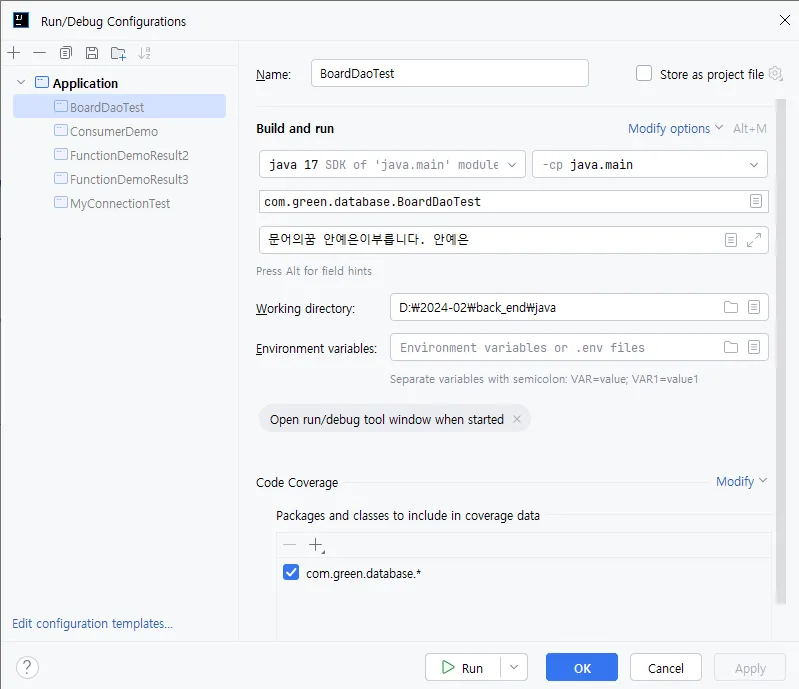 왼쪽 창 Application에서 실행할 클래스(main 메소드 포함)를 선택 후, Program arguments 칸에 데이터를 작성하면 된다.
