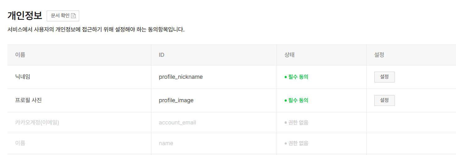 개인정보 박스에서 닉네임, 프로필 사진 [설정] 버튼을 클릭하여 상태를 "필수 동의"로 변경한다.