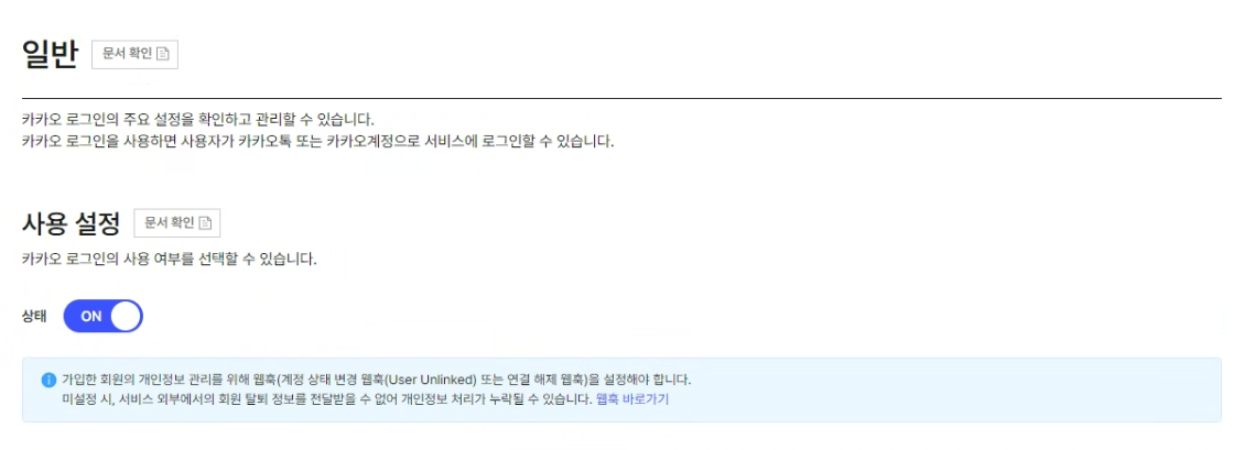 (메뉴) 제품설정 > 카카오 로그인 > 일반 화면
